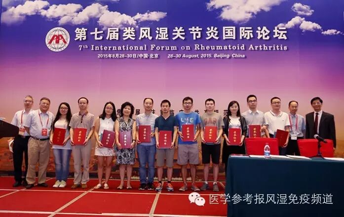 本届大会评选出11篇2014到2015年度类风湿关节炎方面的优秀论文,其中北京大学人员医院的胡凡磊在《Ann Rheum Dis》发表论文“Myeloid-derived suppressor cells have a proinflammatoryrole in the pathogenesis of autoimmune arthritis”,通过杂志影响因子及文章内容等多方面评审评为第一,其他获奖人员还有陈娟、张晓盈、王聪华、戎梦瑶、繆金林、马剑达、李英妮、邓晓莉、段新旺和孟海妹。所有人员均获得第九版《凯利风湿病》中文版。