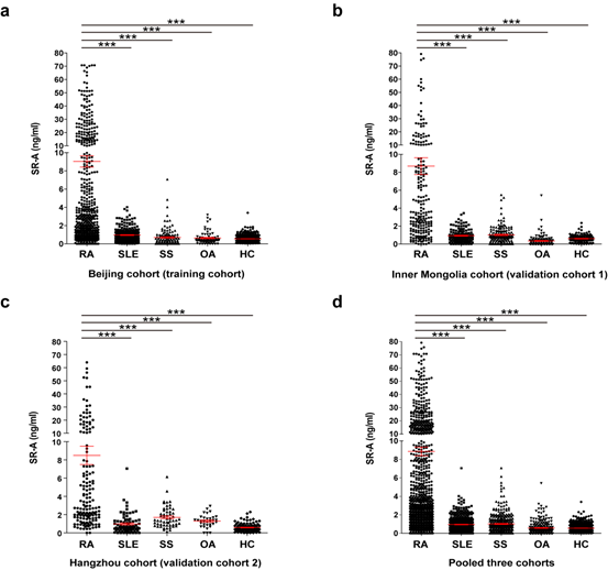 在前期研究基础上,课题组历时5年,并与弗吉尼亚联邦大学Xiang-Yang Wang、包头医学院第一附属医院王永福、浙江大学第二附属医院吴华香、南方医科大学南方医院李娟等课题组合作,通过3000余例患者的大样本研究,揭示SR-A诊断RA具有临床应用价值,尤其对血清阴性及早期RA的诊断有重要意义。