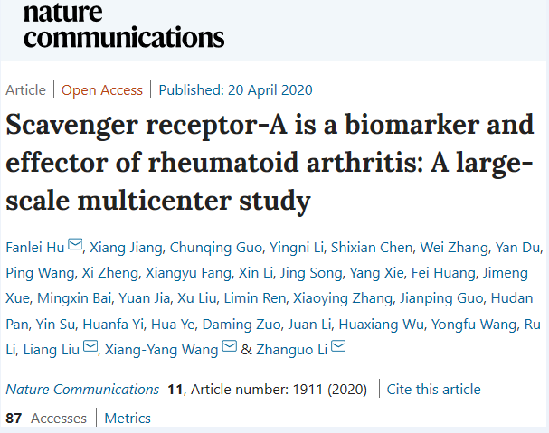 这项研究发现Scavenger receptor A(SR-A)是类风湿关节炎(RA)的致病分子,可促进炎性T细胞和致炎因子产生。通过多中心大样本研究发现,SR-A是一种新型RA生物标志物,尤其可用于血清阴性及早期RA的诊断。课题组利用SR-A-/-小鼠研究证明,SR-A可以促进关节炎小鼠的发病以及病情的加重;靶向抑制SR-A可以缓解关节炎小鼠的症状。这为RA的诊断和治疗提供了新的生物标志物和靶点。