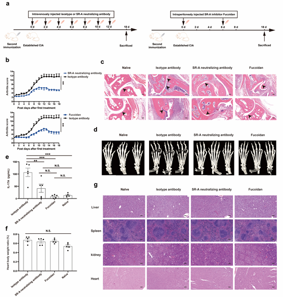 靶向抑制SR-A可改善小鼠关节炎的严重程度。当关节炎评分平均为2分时,给予CIA小鼠静脉注射SR-A中和抗体,或腹腔注射SR-A抑制剂Fucoidan,然后进行疗效和副作用的评估。