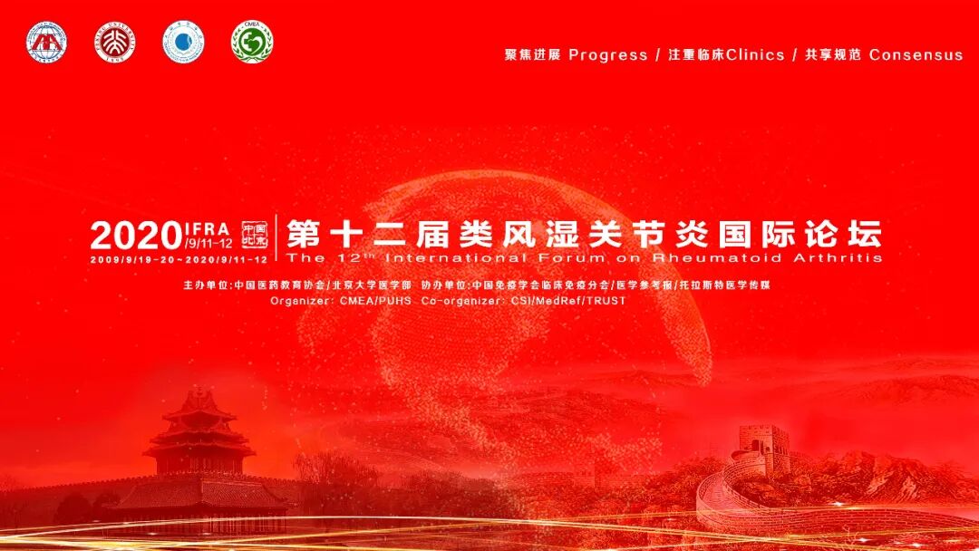 2020年9月11-12日,第12届类风湿关节炎国际论坛(IFRA)以线上直播形式举办。本届会议主题为“聚焦进展、注重临床、共享规范”。来自美国、英国、法国、日本、德国、瑞典、奥地利和印度等国家、地区的国际一流学者与国内专家学者参加了本次论坛。讲者均为国际一流的风湿病及免疫学专家,包括欧洲风湿病联盟(EULAR)、亚太风湿病联盟(APLAR)前任、现任或候任主席,以及著名风湿病学杂志主编等国际知名学者。