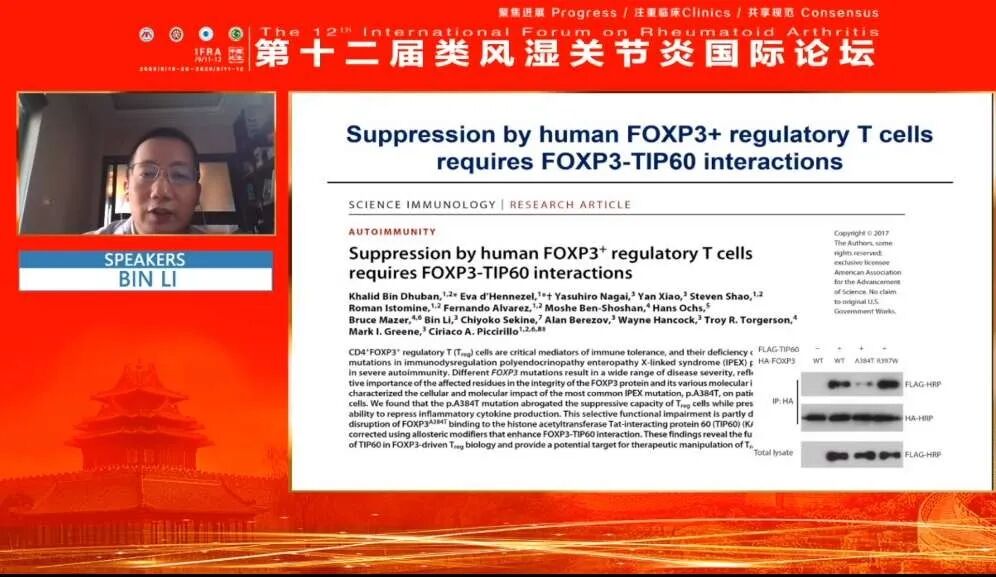 来自上海交通大学的李斌教授以“Foxp3+Treg细胞的功能稳定性和临床应用”为题,从Treg的分化发育层面,讲解了Foxp3+调节性T细胞功能稳定性调节的新机制,涉及Treg缺乏对小鼠和人类免疫稳态的影响,Treg相关靶向治疗研究的挑战性,以及目前Treg研究领域的三大科学问题:不稳定性、可塑性和组织特异性。