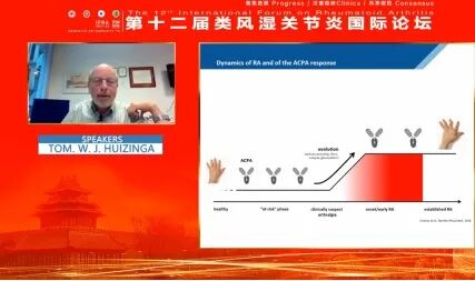 来自荷兰莱顿大学医学中心的风湿病学主席Huizinga教授以“RA病程中针对翻译后修饰抗原的自身抗体反应的动态演变”为题,对ACPA阳性个体的疾病演变进行了讲述。