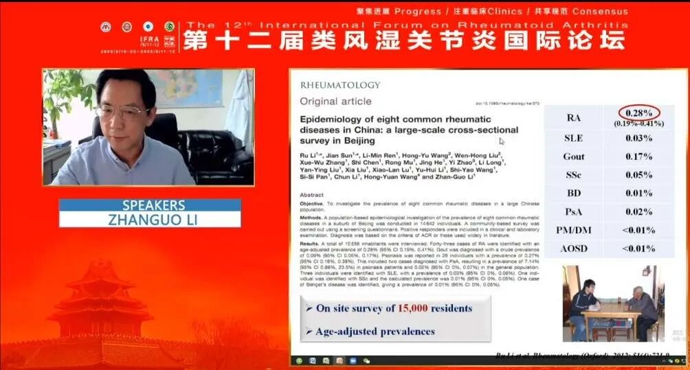 北京大学人民医院的栗占国教授以“中国类风湿关节炎的研究进展”为题,从流行病学方面指出类风湿关节炎缓解率低、致残率高的现状。在发病机制方面,强调了新型细胞亚群CD4+ CXCR5+ CCR7lo PD-1hiTfh细胞与抗体产生和疾病活动的相关性,指出该新型细胞亚群可能作为RA靶向治疗的生物学标记。
